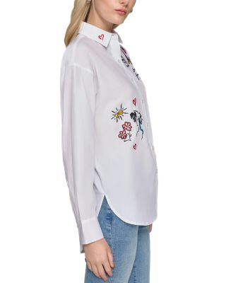 شومیز Oversized Whimsy Button-Up از برند لوکس Karl Lagerfeld یک آیتم خاص و هنری برای استایلهای مدرن و فشن است. این مدل با طراحی اورسایز (Oversized Fit) و گلدوزیهای فانتزی و گرافیکی در قسمتهای مختلف لباس، جلوهای متفاوت و خاص به استایل شما میدهد.