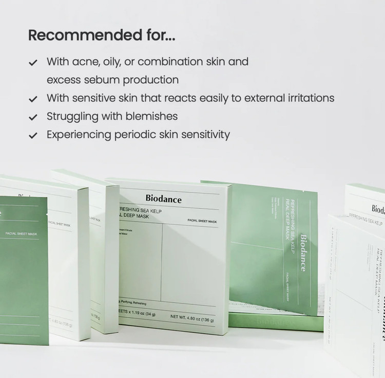 ماسک Refreshing Sea Kelp Real Deep Mask از برند Biodance یک ماسک هیدروژل طراحیشده برای آبرسانی عمقی، کاهش قرمزی و متعادلکردن چربی پوست است. این ماسک با ترکیبات دریایی و معدنی، حالت آرامشبخش و طراوت بخش به پوست میدهد و به بهبود بافت ناهموار کمک میکند.